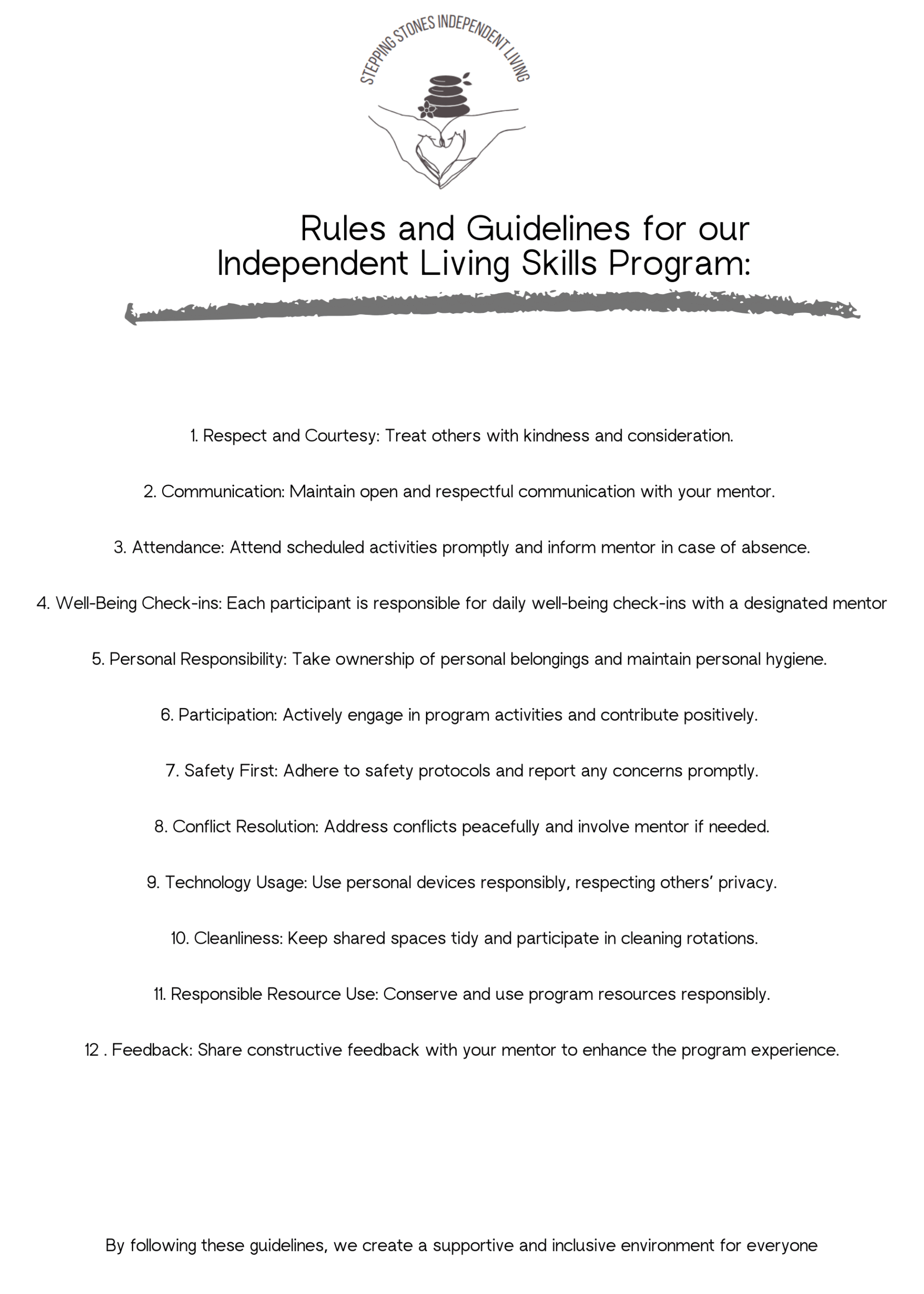 At Stepping Stones, we believe in the philosophy of Independent Living, which emphasizes your right to make your own choices, take calculated risks, and live a life defined by your goals. These guidelines ensure a clear, safe, and respectful partnership between you and our staff.